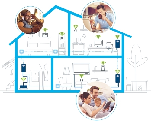 De installatie van WiFi Powerline adapters is heel eenvoudig. U sluit één LAN-adapter aan op uw router, steekt alle LAN- en wifi-adapters waar nodig in het stopcontact en kunt vervolgens snel aan de slag. Heeft een adapter te weinig LAN-poorten, sluit dan een switch aan.